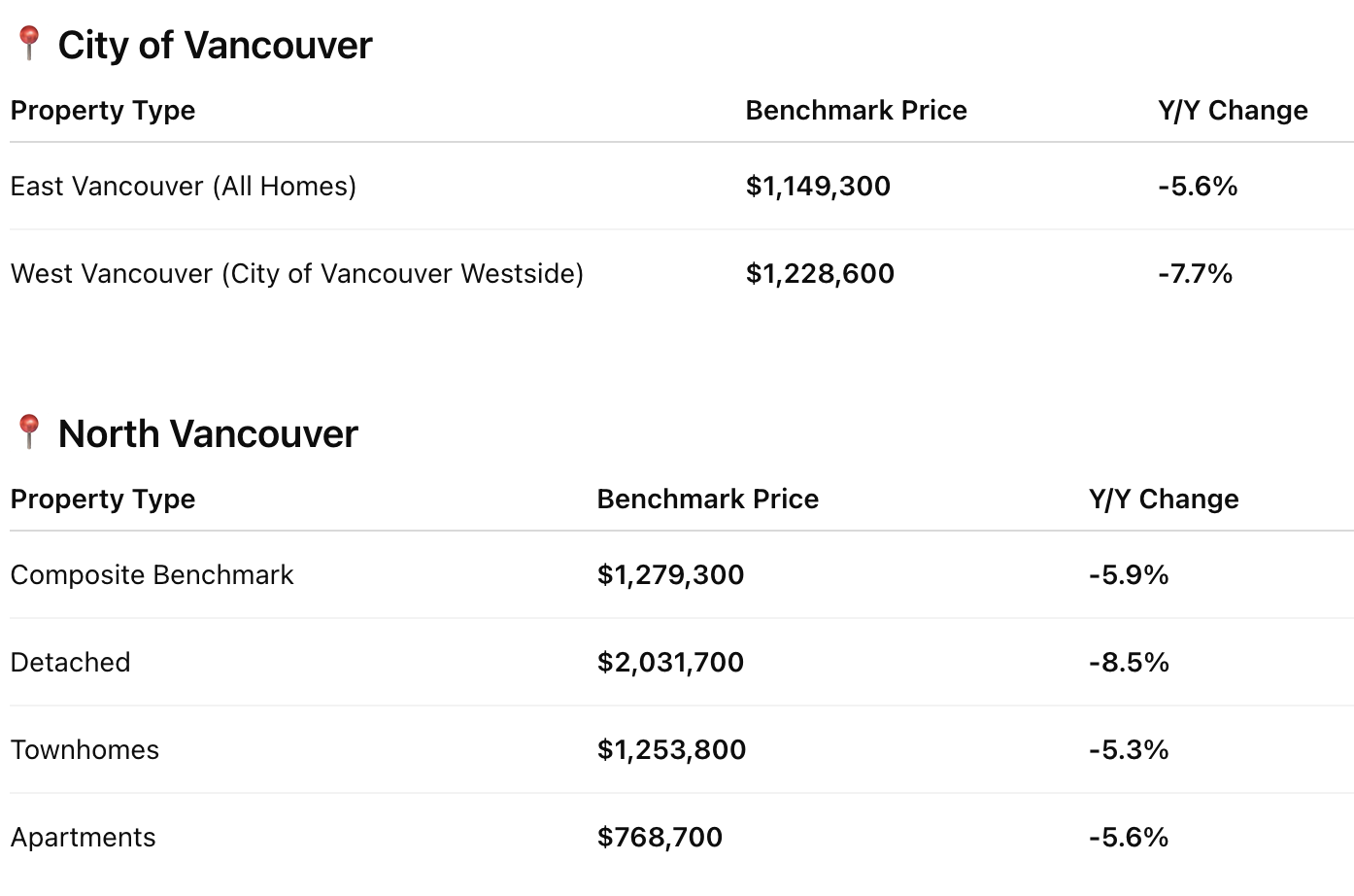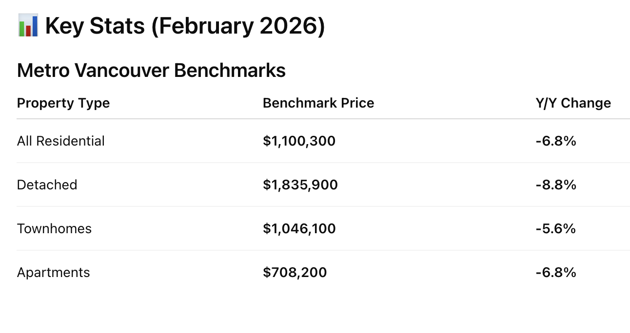Metro Vancouver composite benchmarks are confirmed from official GVR monthly press releases (Mar 2025–Feb 2026). City of Vancouver (VanEast + VanWest blended) and North Vancouver area figures are sourced from GVR area stats packages and North Shore market reports. North Vancouver detached benchmarks confirmed monthly; composite all-residential derived from property-type weighted averages where applicable. All figures in CAD. Source: REBGV / Greater Vancouver REALTORS® (GVR).